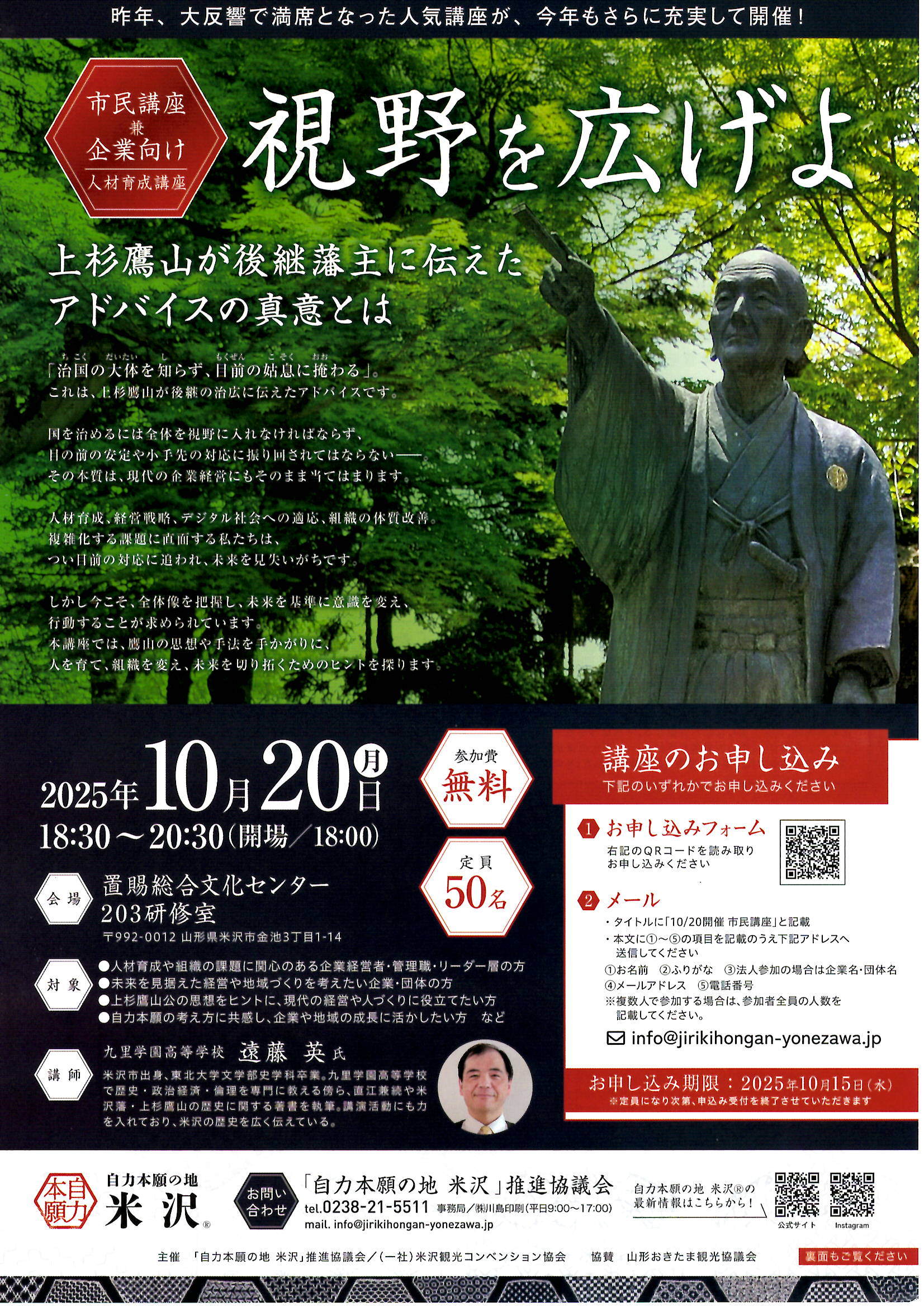 市民講座兼企業向け人材育成講座「視野を広げよ~上杉鷹山が後継藩主に伝えたアドバイスの真意とは~」10/20(月)開催・参加費無料