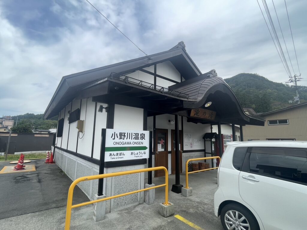 旅人が温泉街を訪れて温泉で癒されるというコンセプトの駅舎風フォトスポットも滝湯前に設置中です!