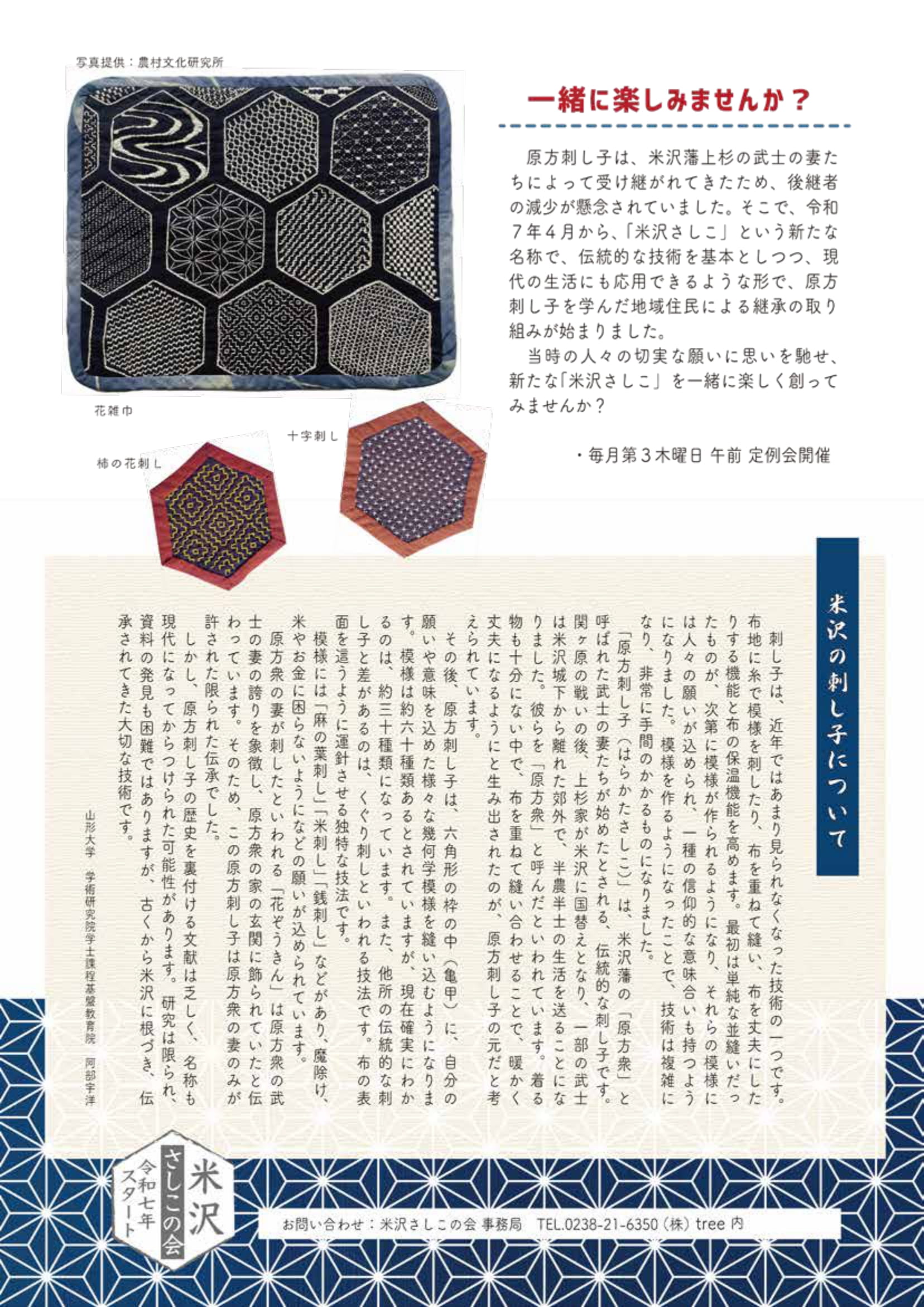 原方刺し子は、米沢藩上杉の武士の妻たちによって受け継がれてきたため、後継者の減少が懸念されていました。そこで、令和7年4月から、「米沢さしこ」という新たな名称で、伝統的な技術を基本としつつ、現代の生活にも応用できるような形で、原方刺し子を学んだ地域住民による継承の取り組みが始まりました。