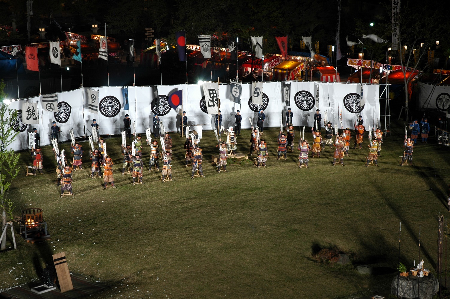 赤々と燃えるかがり火の中で、五沾水(ごてんすい)の儀・軍神勧請の儀、上杉鉄砲隊の発砲、上杉太鼓の披露などが約1時間にわたり荘厳にとり行われ、つめかけた観客をしばし戦国の世へ誘います。